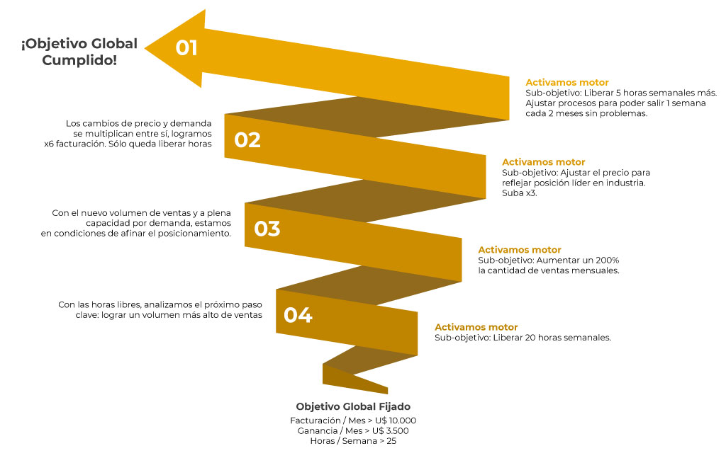Así como cada sub-objetivo será un nuevo nivel que tu negocio alcanza, la suma de todos los pasos cumplidos llevará a que alcancemos el objetivo global.