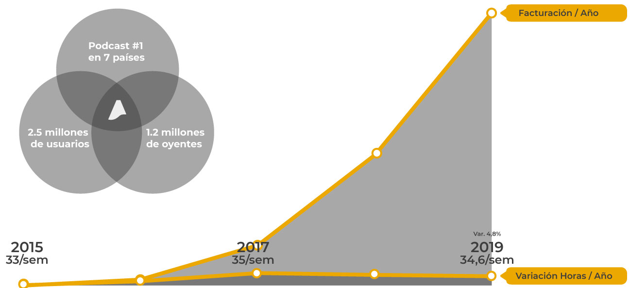 Sin embargo, la facturación en 5 años aumentó un 60.000%. En el camino, llegamos a más de 3.000.000 de usuarios en 196 países y 1.200.000 oyentes en el Podcast.